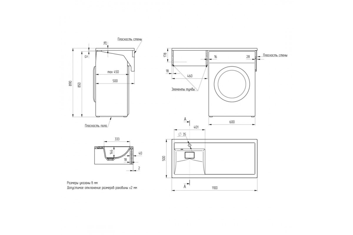 Раковина над стиральной машиной Uperwood Magenta 110 см, левая 2490000012